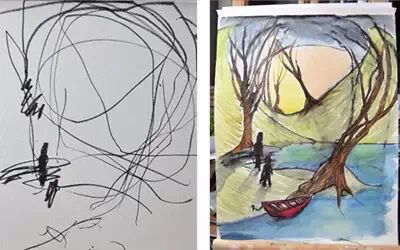 等到女儿能画出比较连贯的线条和大致轮廓时,Ruth了解了她的作画意图后在原画的构架上施以水彩,试图还原女儿眼中的世界,第一幅合作作品《红船》就这么完成了。